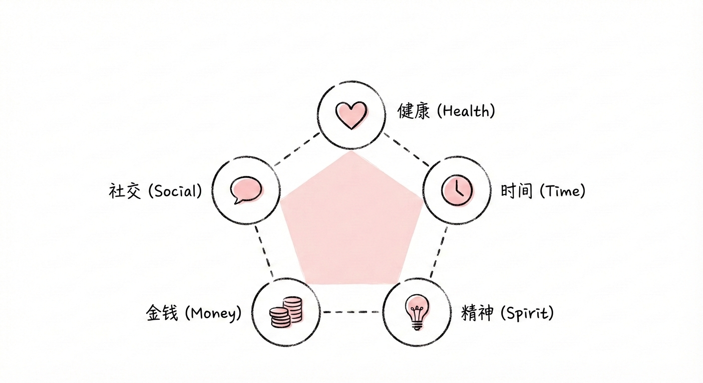 金钱: 金钱是实现目标的工具。它是经济基础与财务安全感,而非最终目的。要定义自己的“富足线”,理解自由在于资源与欲望的平衡。在达到满足点后,从“赚更多”转向“用好财富”,通过提升核心技能、复利思维和风险分散来实现财务的长期稳健。